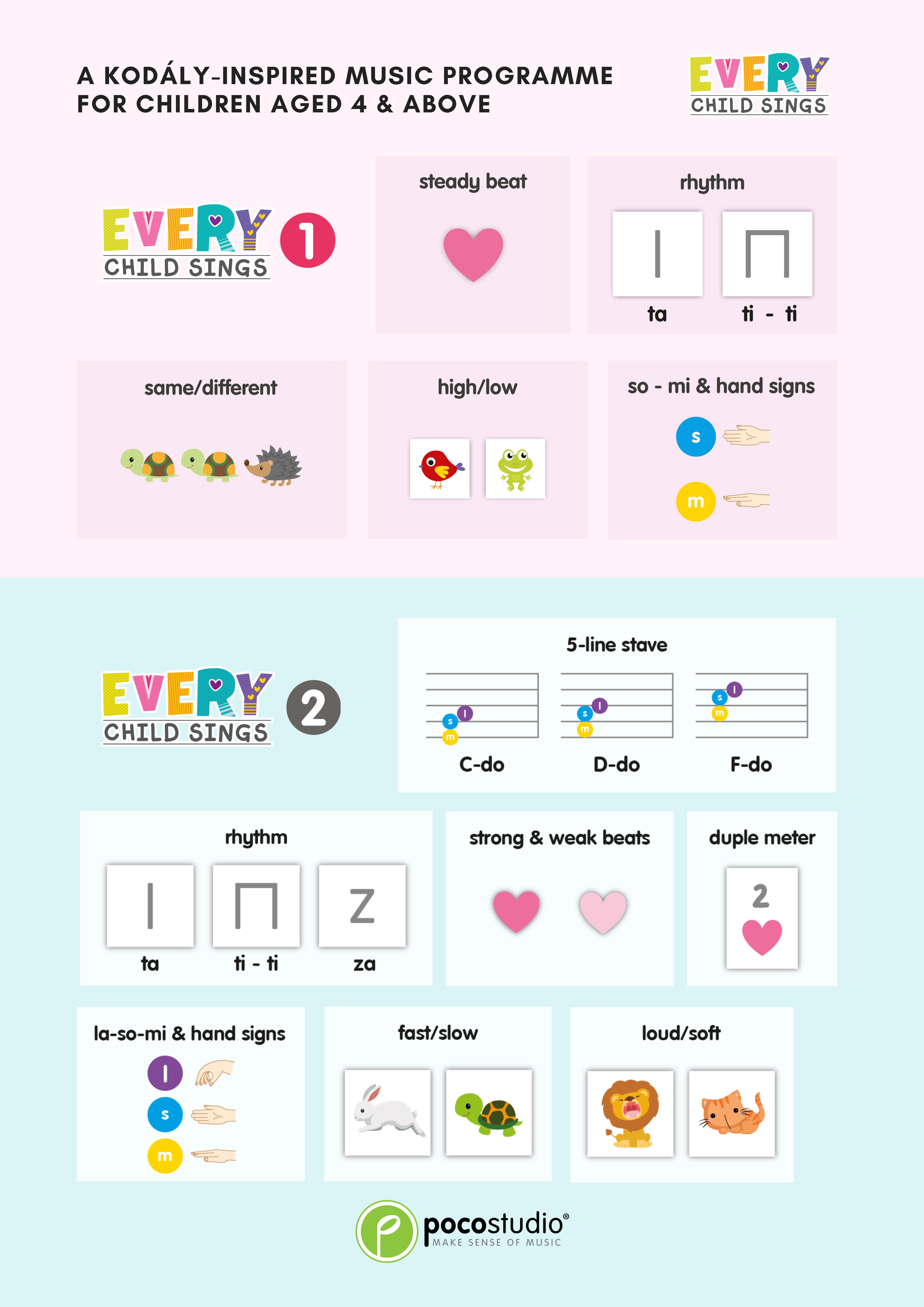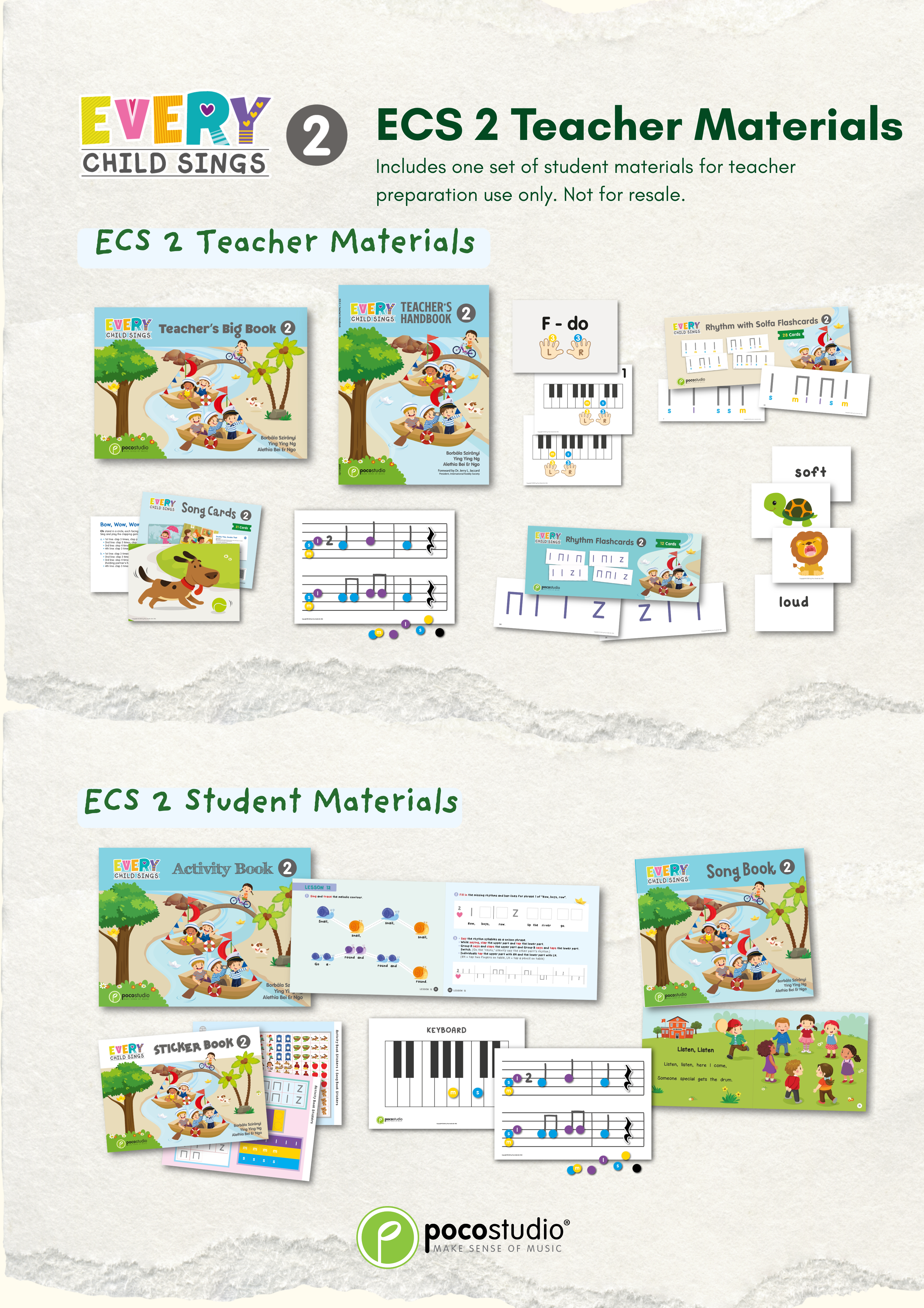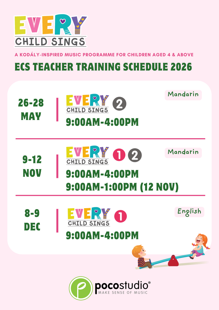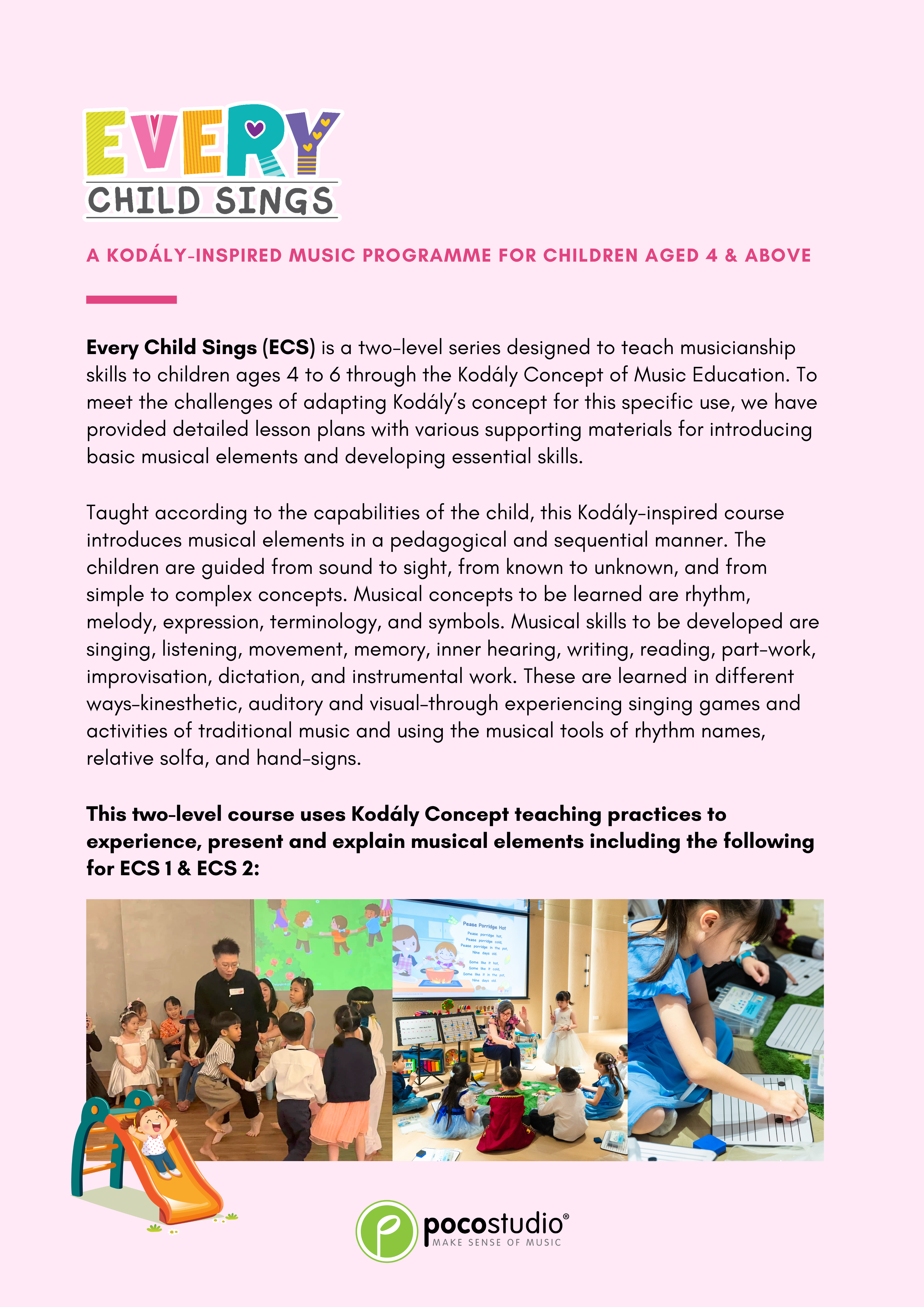 In ECS 2, Piano will be introduced as an optional lesson. The singing part is required for all children, whereas the instrument part is only for the children who choose to learn ECS Piano, which component was led by Ying Ying Ng, the co-author of the popular POCO Piano series published by Poco Studio. In accordance with the principles of the Kodály method, all concepts are introduced through singing before playing on the piano so that musicality can be developed rather than only mechanical skills.