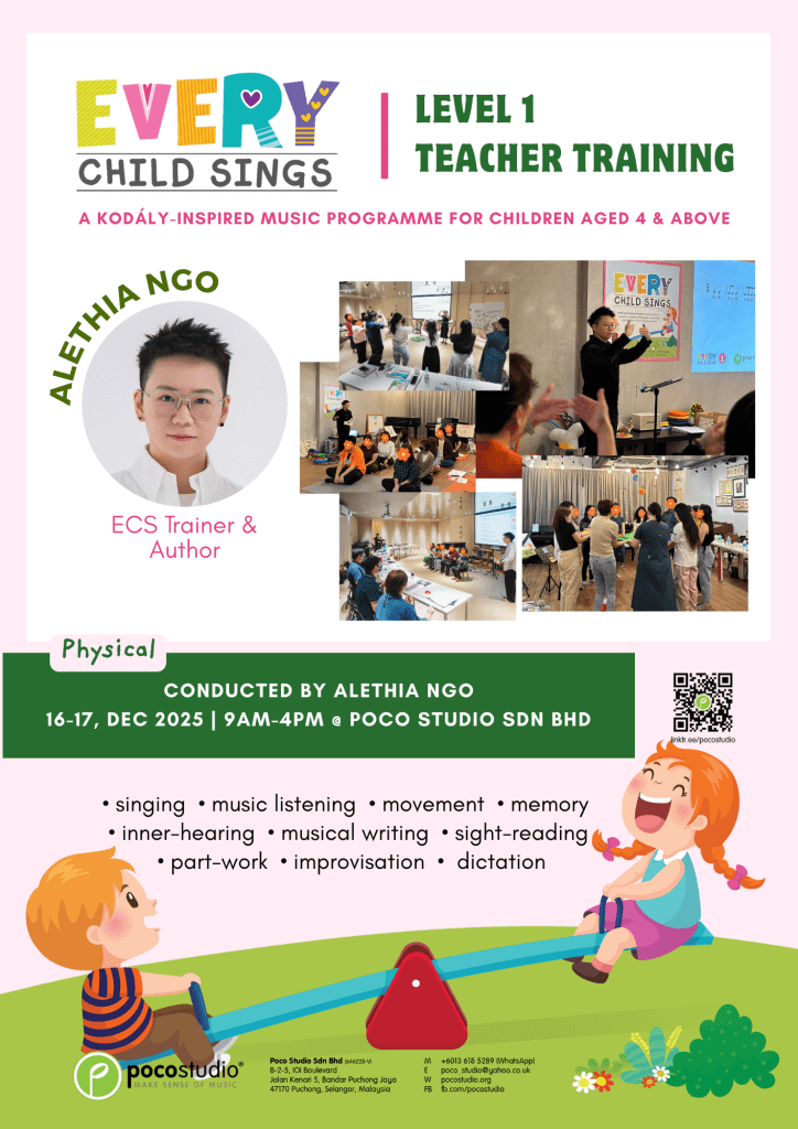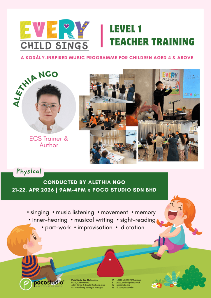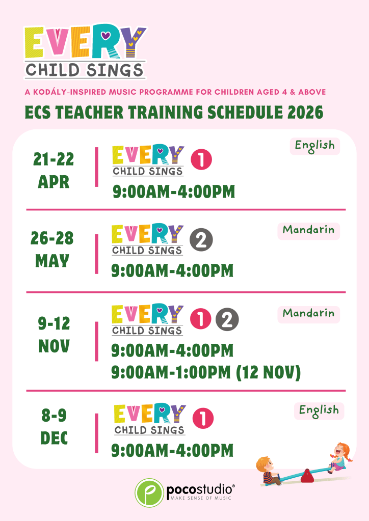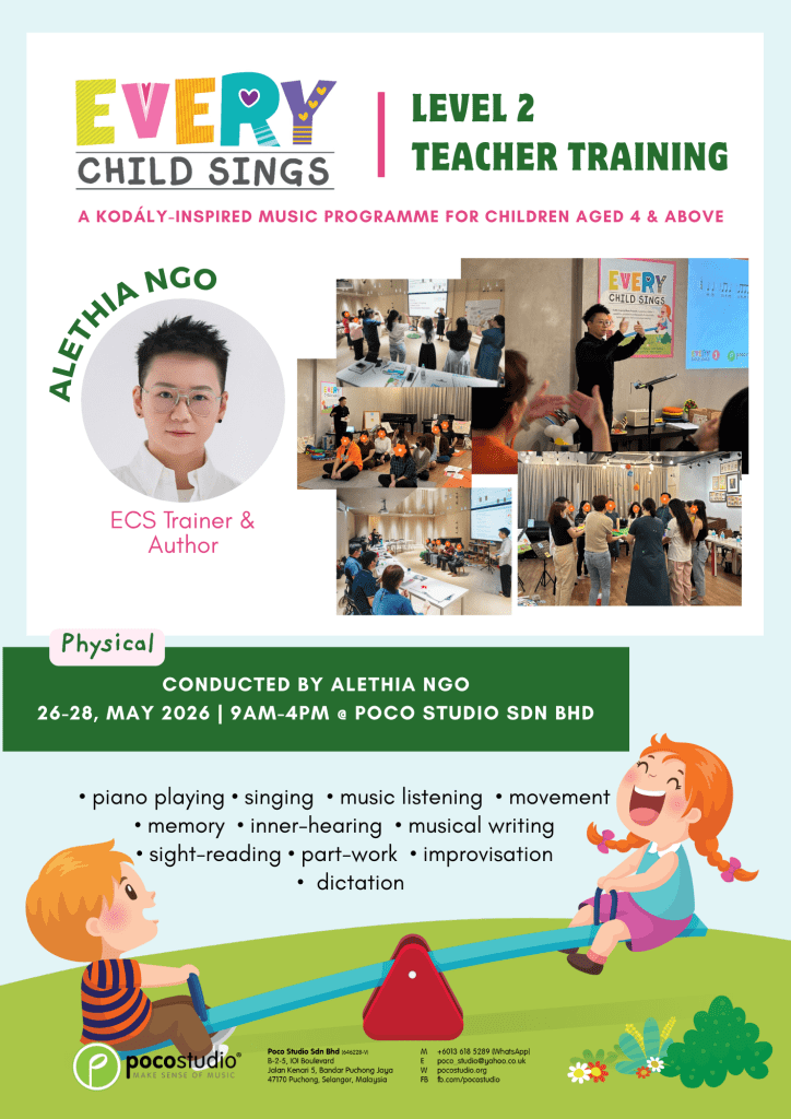 In ECS 2, Piano will be introduced as an optional lesson. The singing part is required for all children, whereas the instrument part is only for the children who choose to learn ECS Piano, which component was led by Ying Ying Ng, the co-author of the popular POCO Piano series published by Poco Studio. In accordance with the principles of the Kodály method, all concepts are introduced through singing before playing on the piano so that musicality can be developed rather than only mechanical skills.