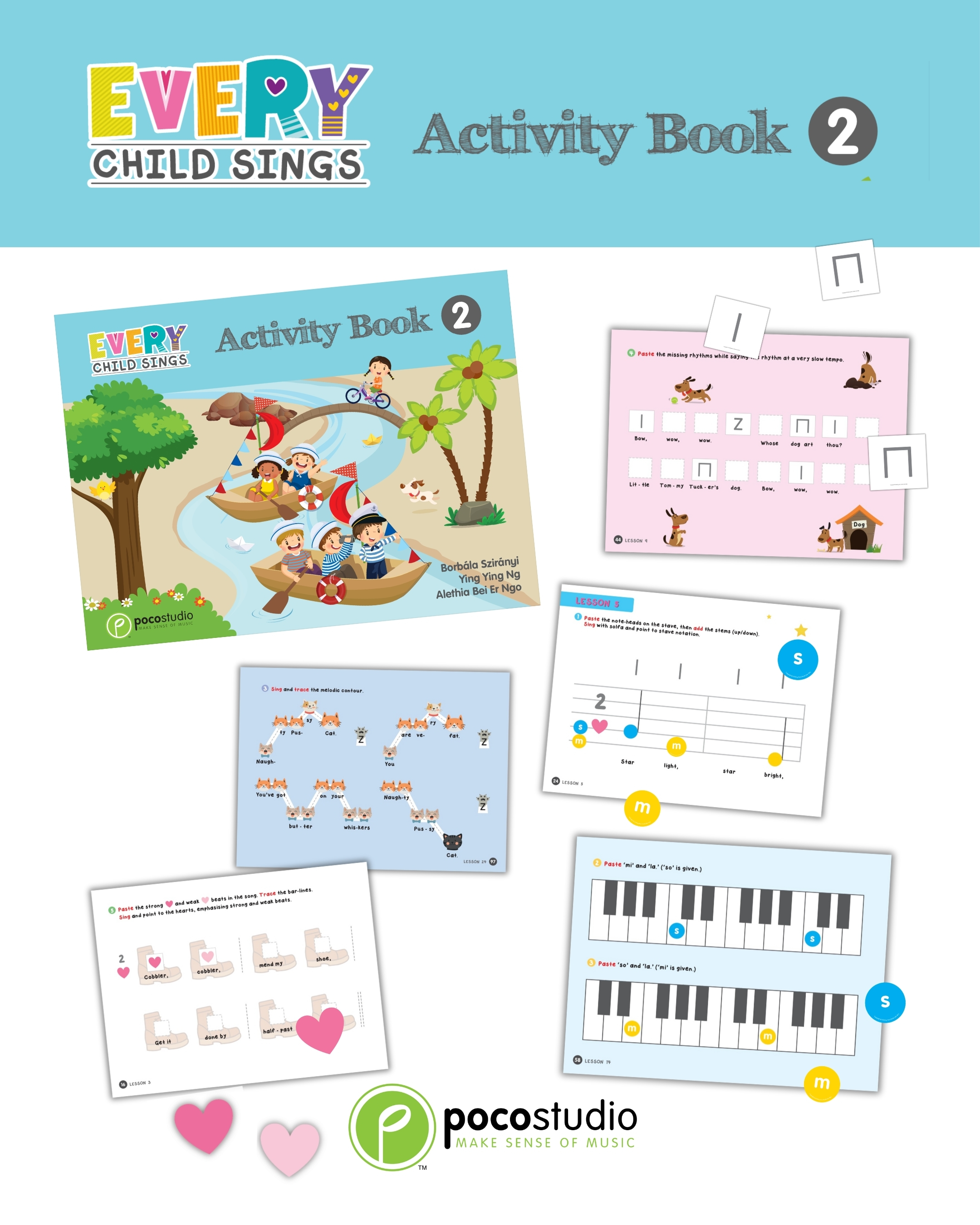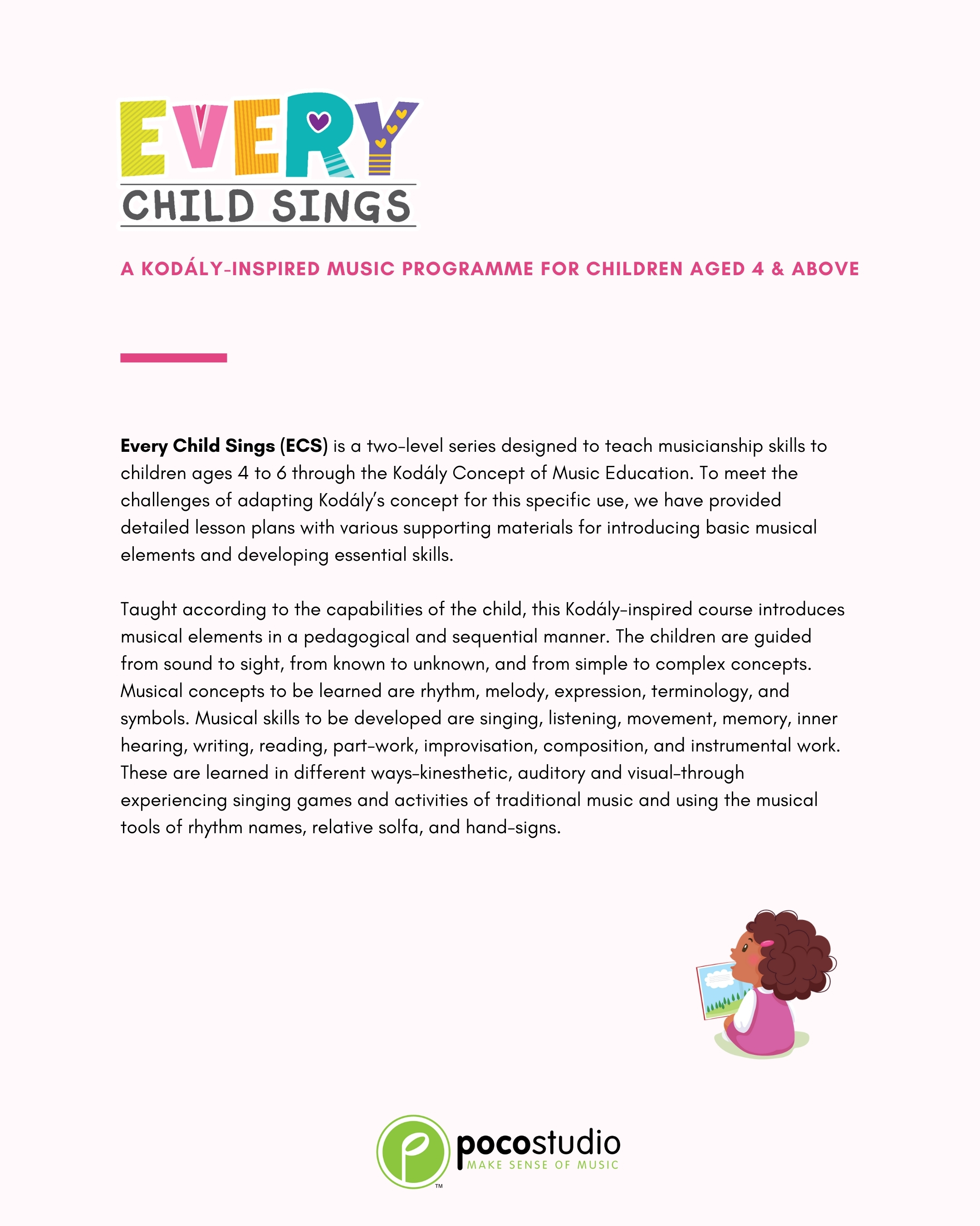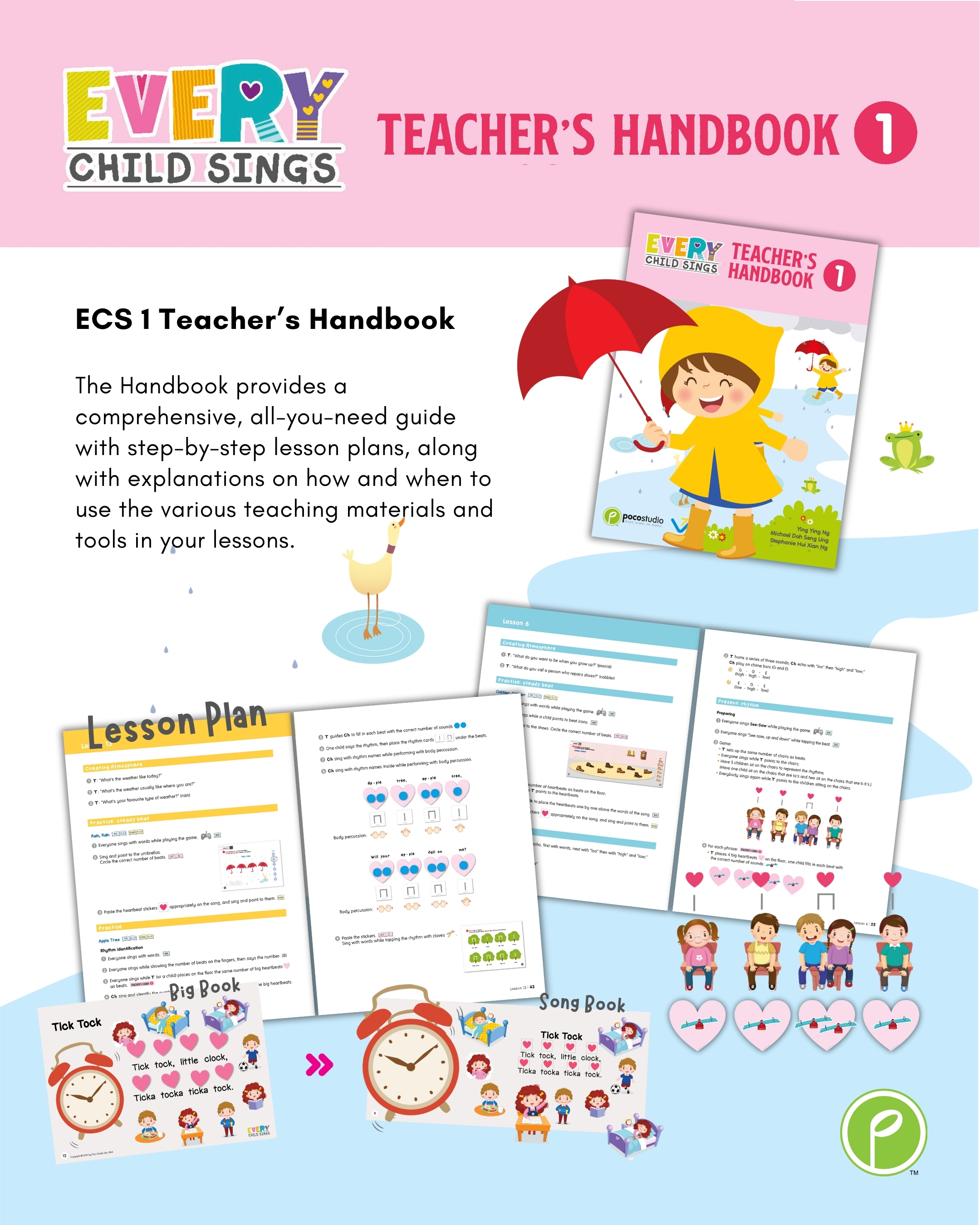 In ECS 2, Piano will be introduced as an optional lesson. The singing part is required for all children, whereas the instrument part is only for the children who choose to learn ECS Piano, which component was led by Ying Ying Ng, the co-author of the popular POCO Piano series published by Poco Studio. In accordance with the principles of the Kodály method, all concepts are introduced through singing before playing on the piano so that musicality can be developed rather than only mechanical skills.