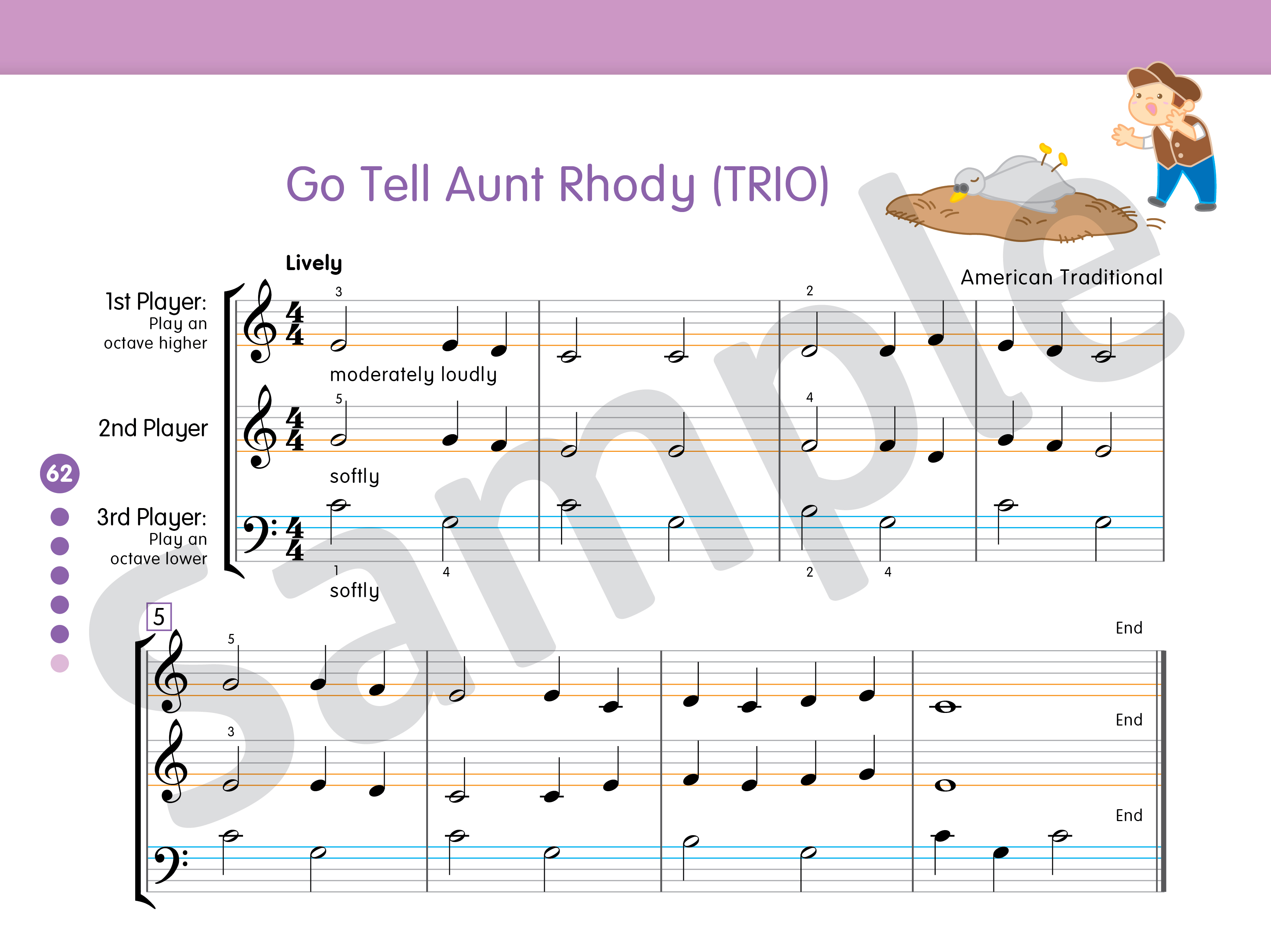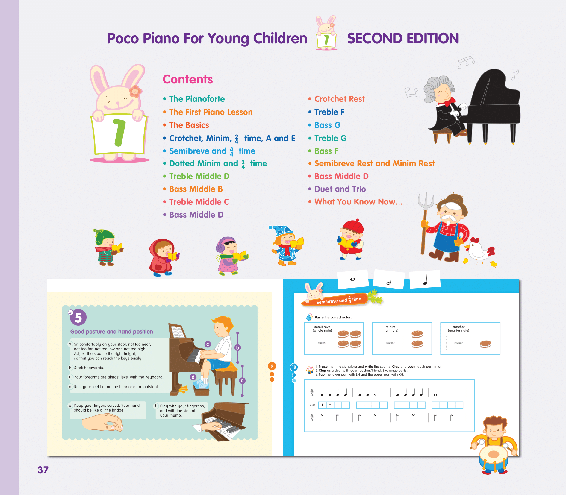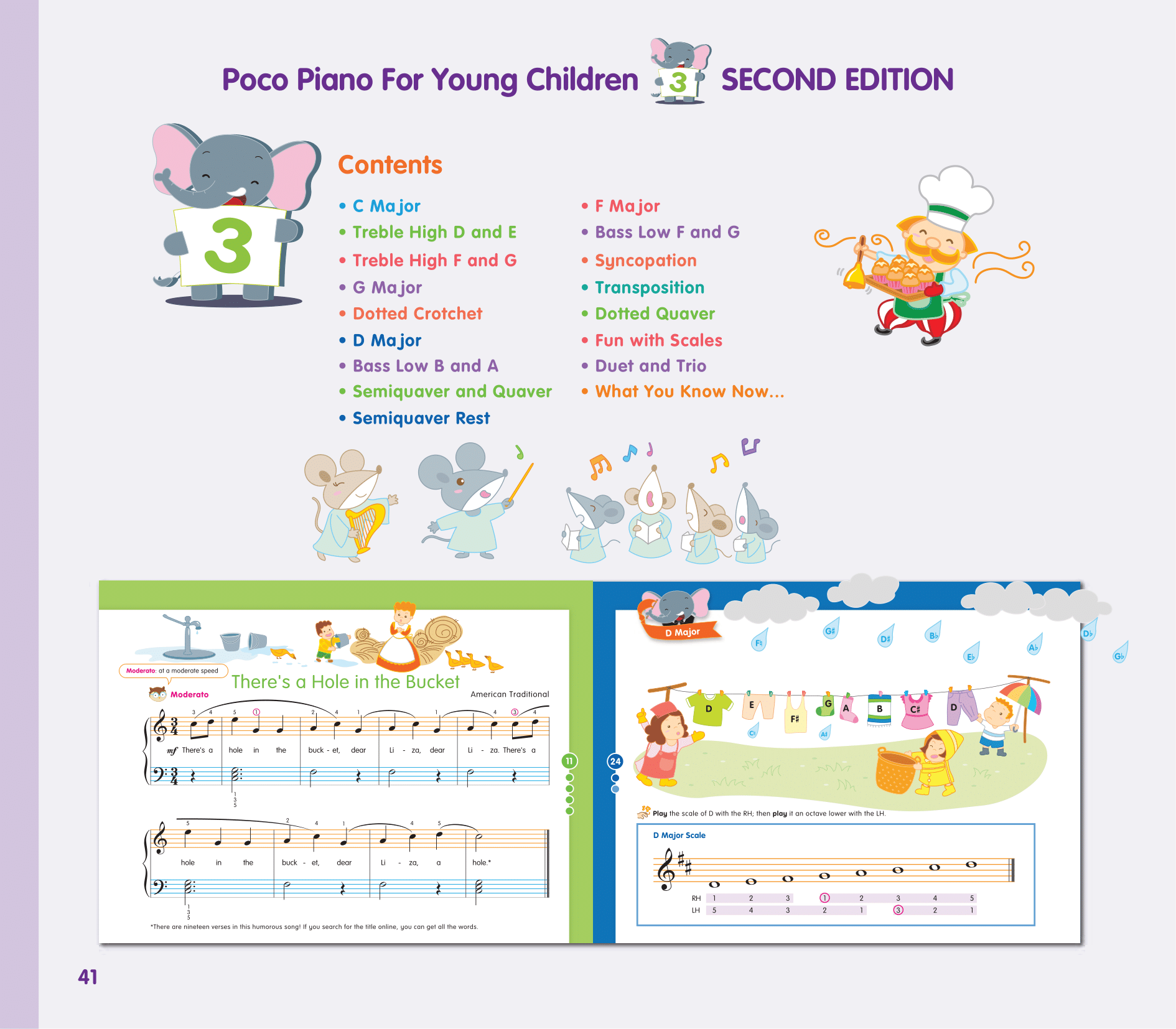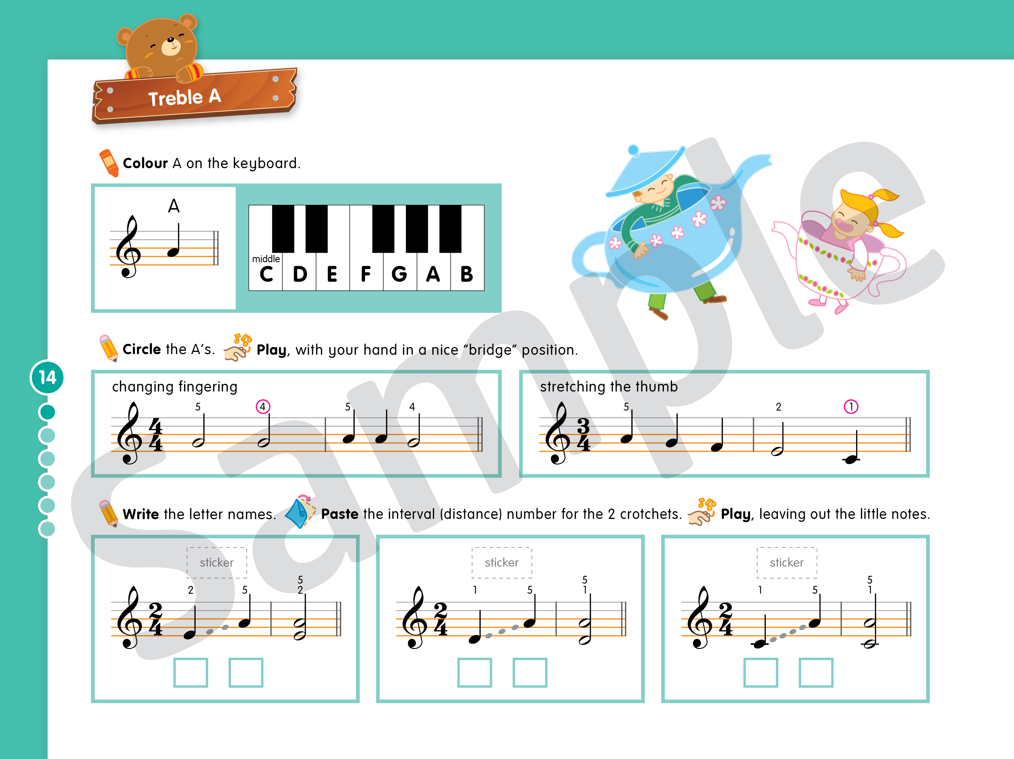 Book 3 introduces the concepts of key, key signature, scales, triads, tones, and semitones in a novel and exciting way: each key is a group of characters or objects with note-names (i.e. a band, a birthday party, a clothes-line with garments). Certain notes belong, while all other notes (accidentals) are outsiders. Transposition is a natural outcome of this concept, with a tune moving from one group to another. The child masters eight new notes (up to Treble High G and down to Bass Low F), which facilitates the playing of a more adventurous repertoire The semiquaver, semiquaver rest, dotted crotchet, and dotted quaver are introduced, and tempo markings are now in Italian. As in the previous two books, ensemble-playing is encouraged.