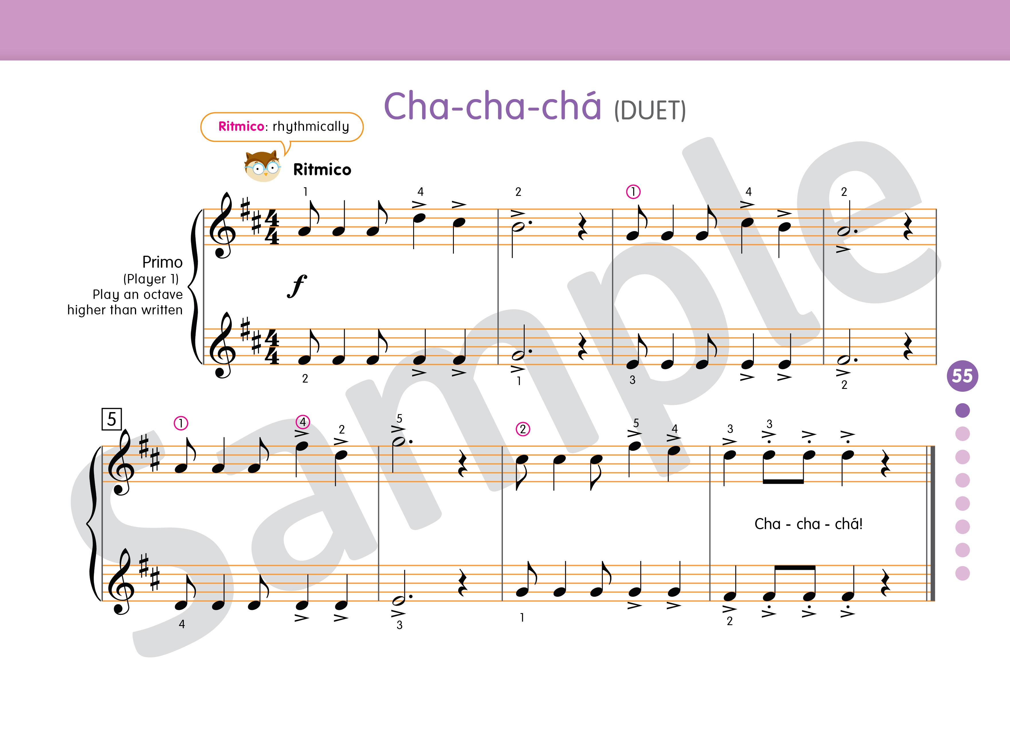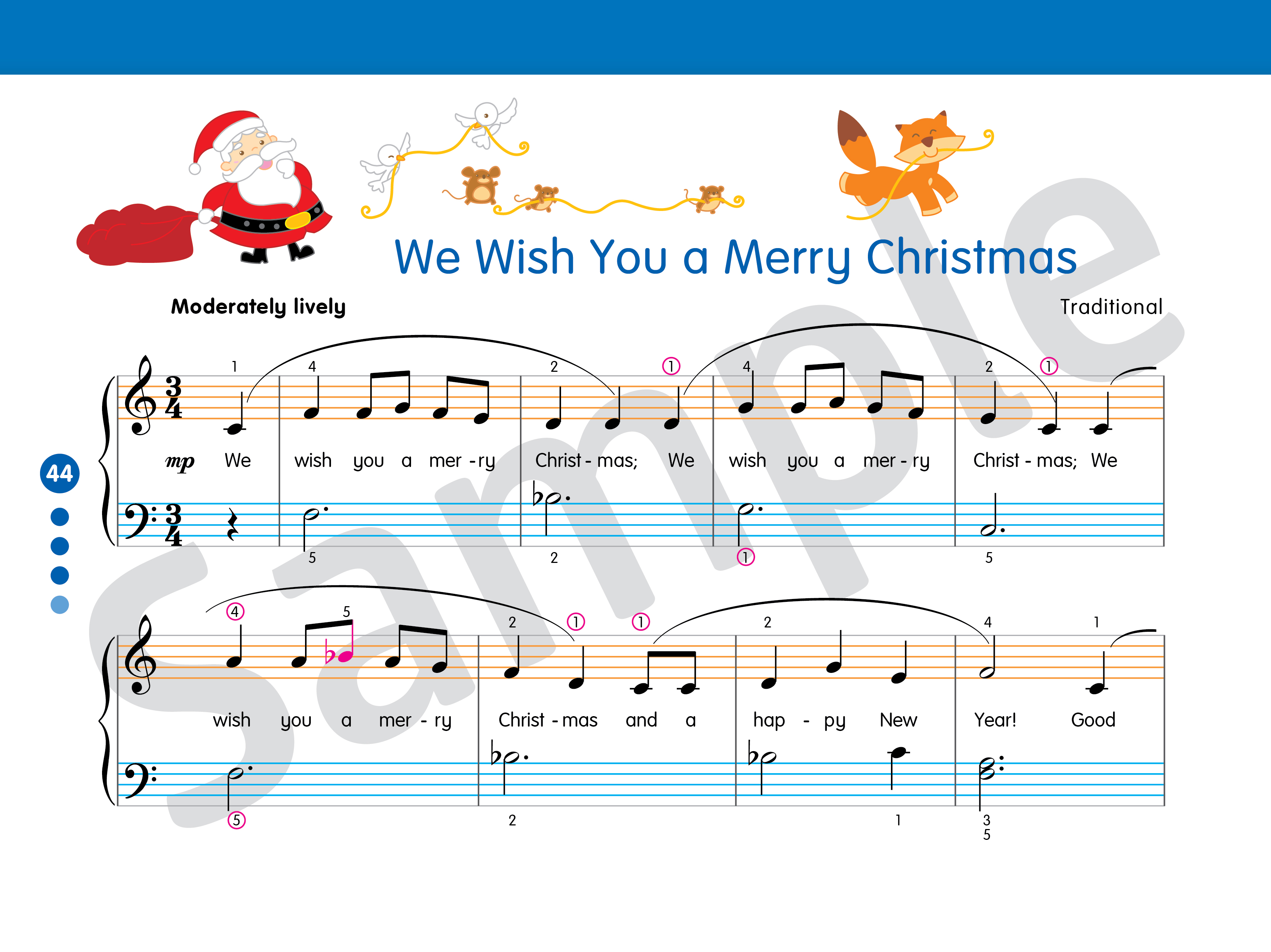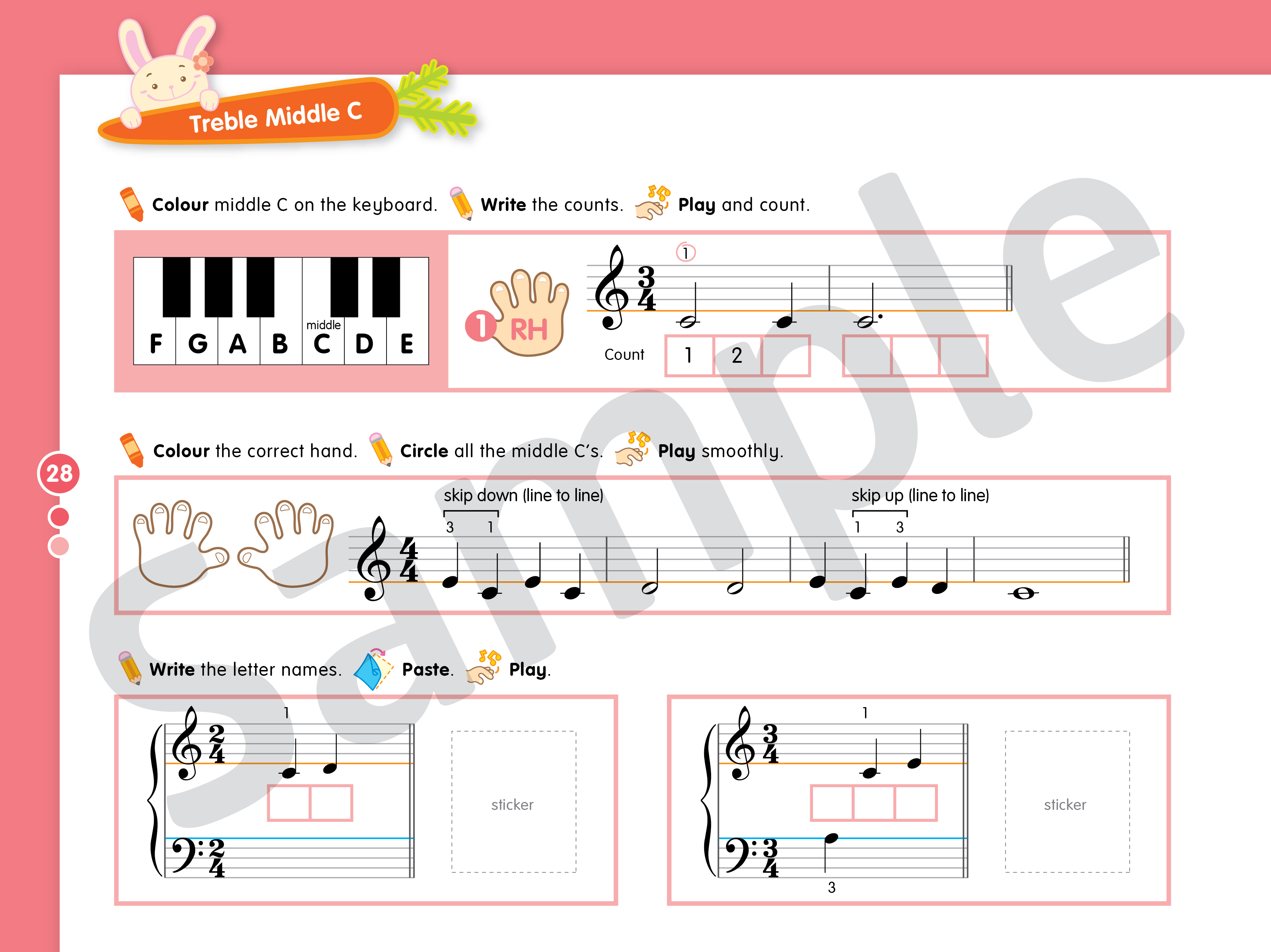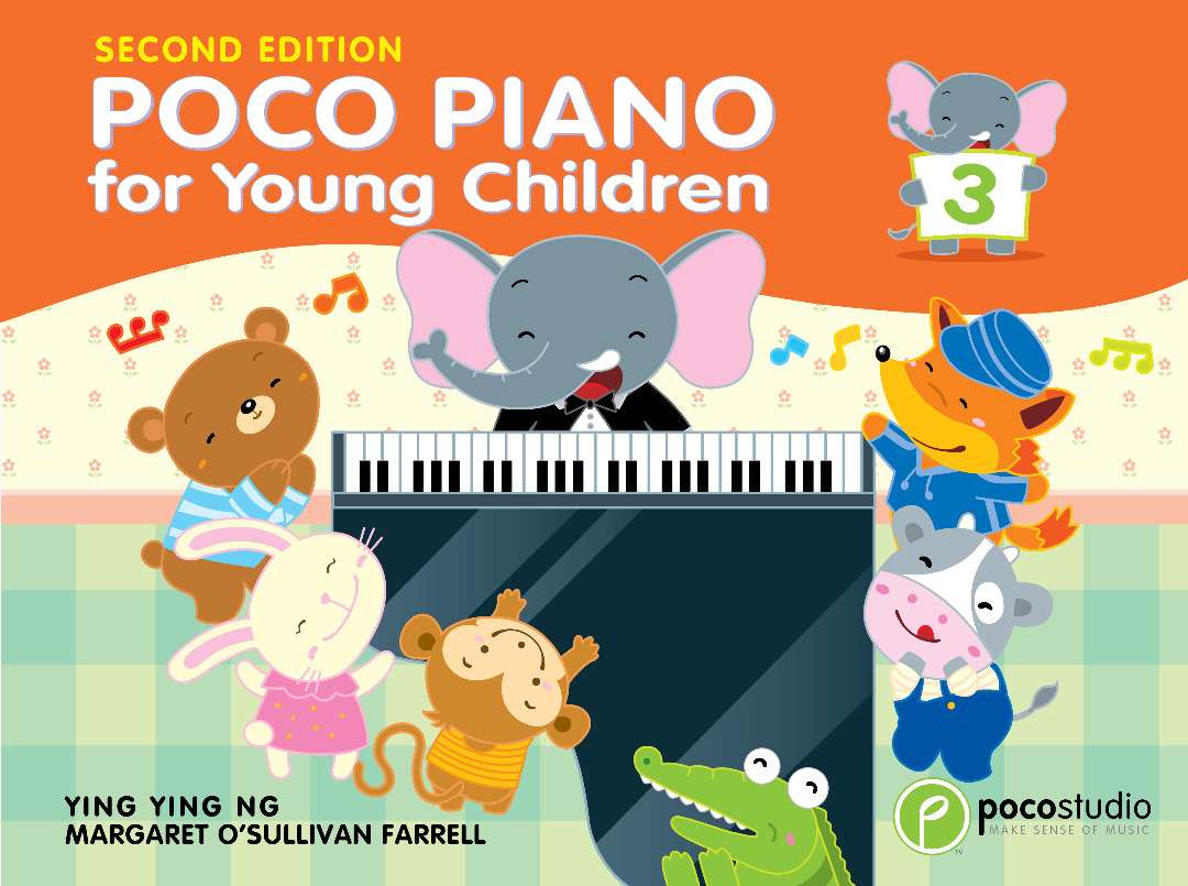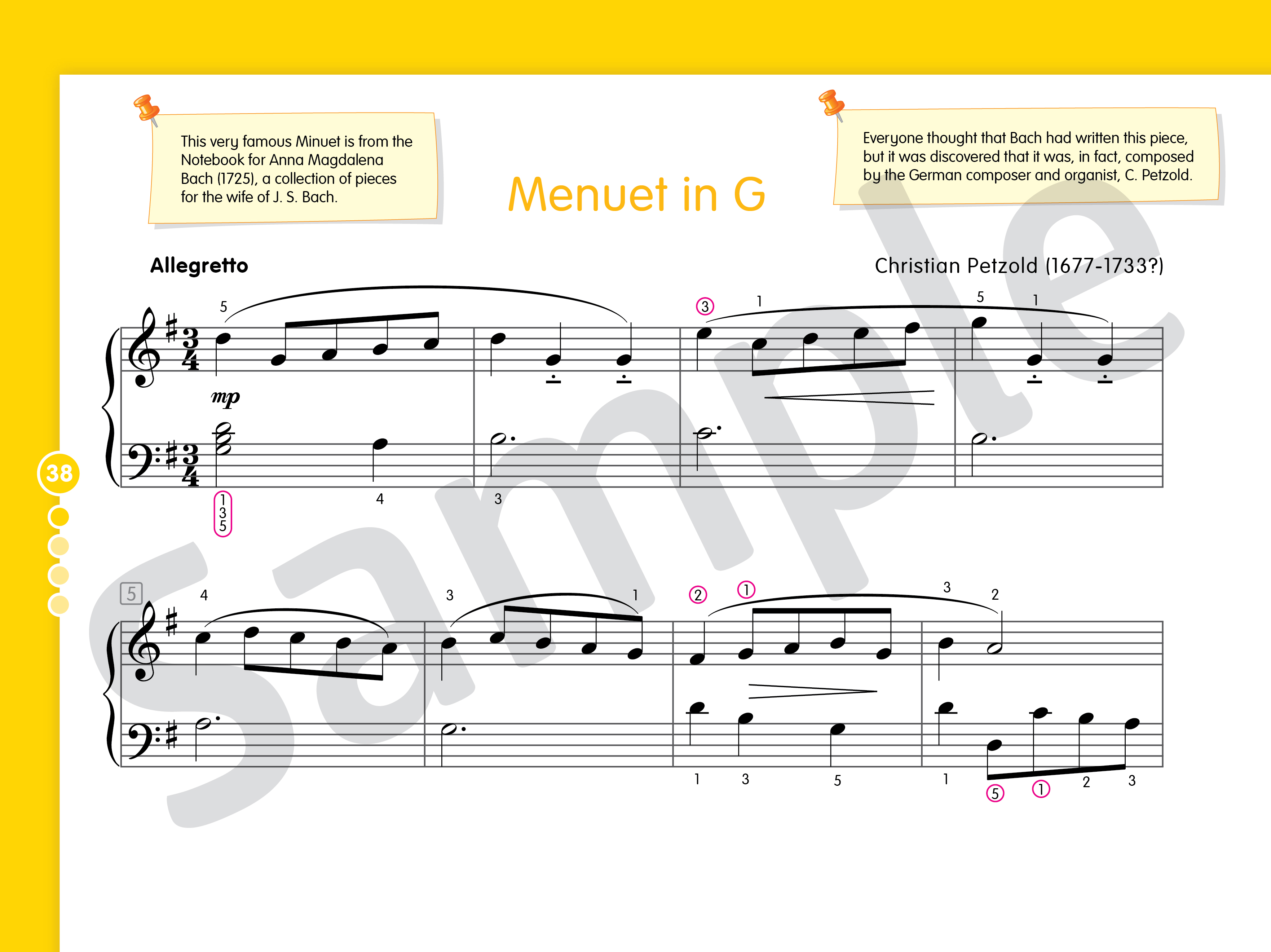 Book 3 introduces the concepts of key, key signature, scales, triads, tones, and semitones in a novel and exciting way: each key is a group of characters or objects with note-names (i.e. a band, a birthday party, a clothes-line with garments). Certain notes belong, while all other notes (accidentals) are outsiders. Transposition is a natural outcome of this concept, with a tune moving from one group to another. The child masters eight new notes (up to Treble High G and down to Bass Low F), which facilitates the playing of a more adventurous repertoire The semiquaver, semiquaver rest, dotted crotchet, and dotted quaver are introduced, and tempo markings are now in Italian. As in the previous two books, ensemble-playing is encouraged.