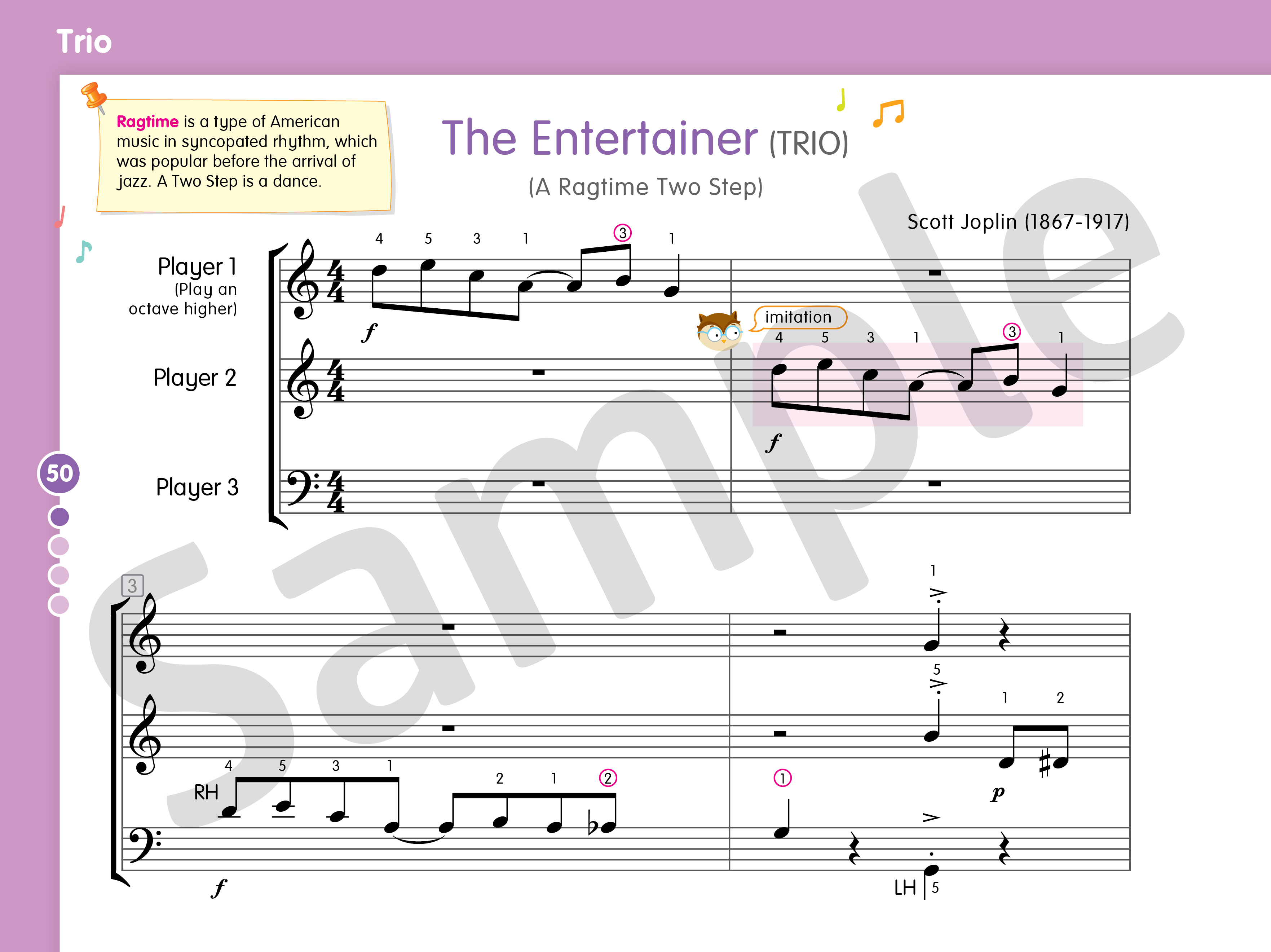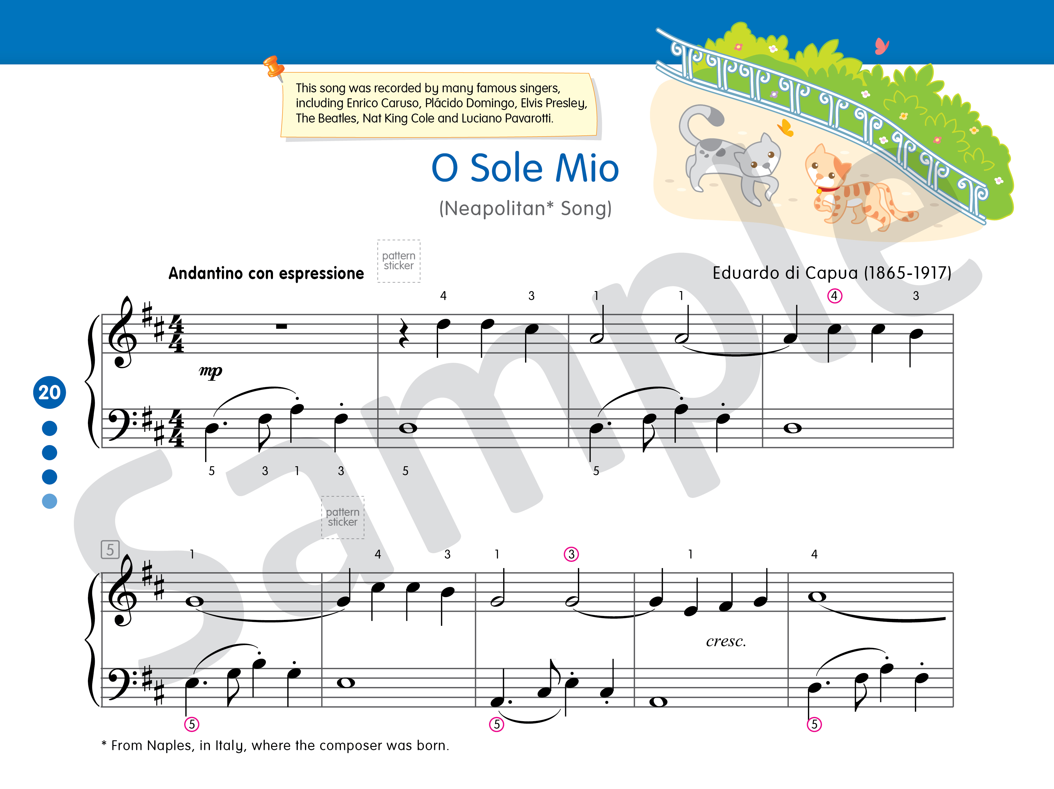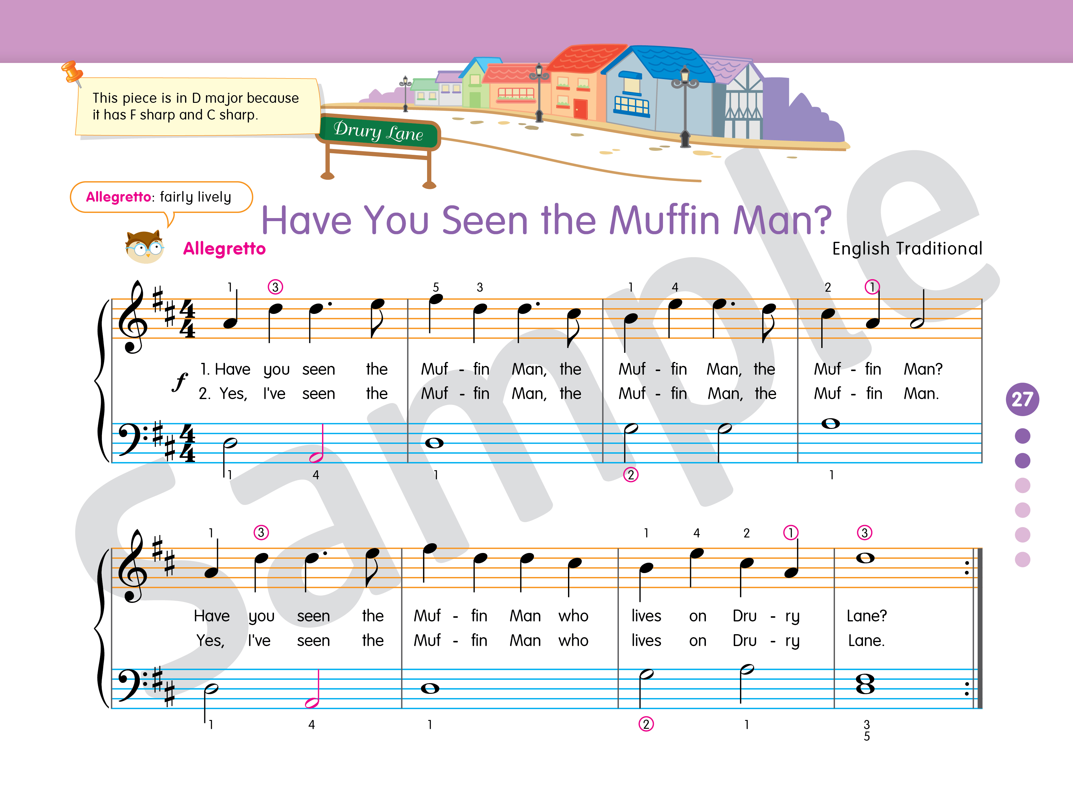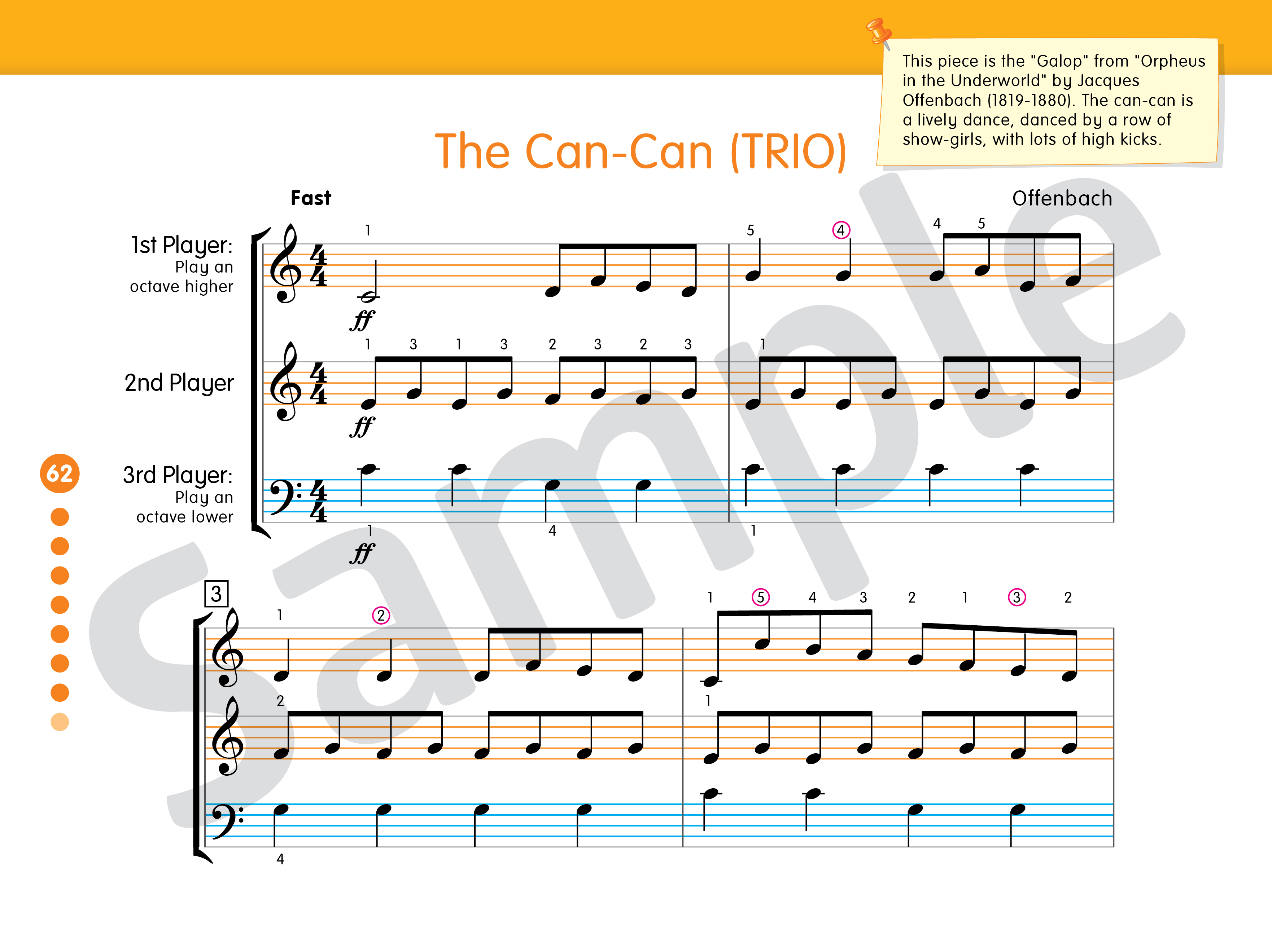 Book 3 introduces the concepts of key, key signature, scales, triads, tones, and semitones in a novel and exciting way: each key is a group of characters or objects with note-names (i.e. a band, a birthday party, a clothes-line with garments). Certain notes belong, while all other notes (accidentals) are outsiders. Transposition is a natural outcome of this concept, with a tune moving from one group to another. The child masters eight new notes (up to Treble High G and down to Bass Low F), which facilitates the playing of a more adventurous repertoire The semiquaver, semiquaver rest, dotted crotchet, and dotted quaver are introduced, and tempo markings are now in Italian. As in the previous two books, ensemble-playing is encouraged.