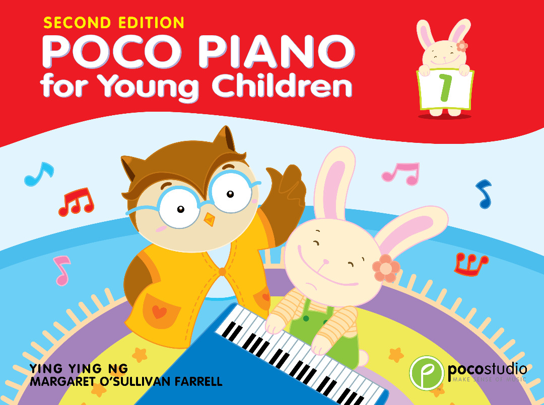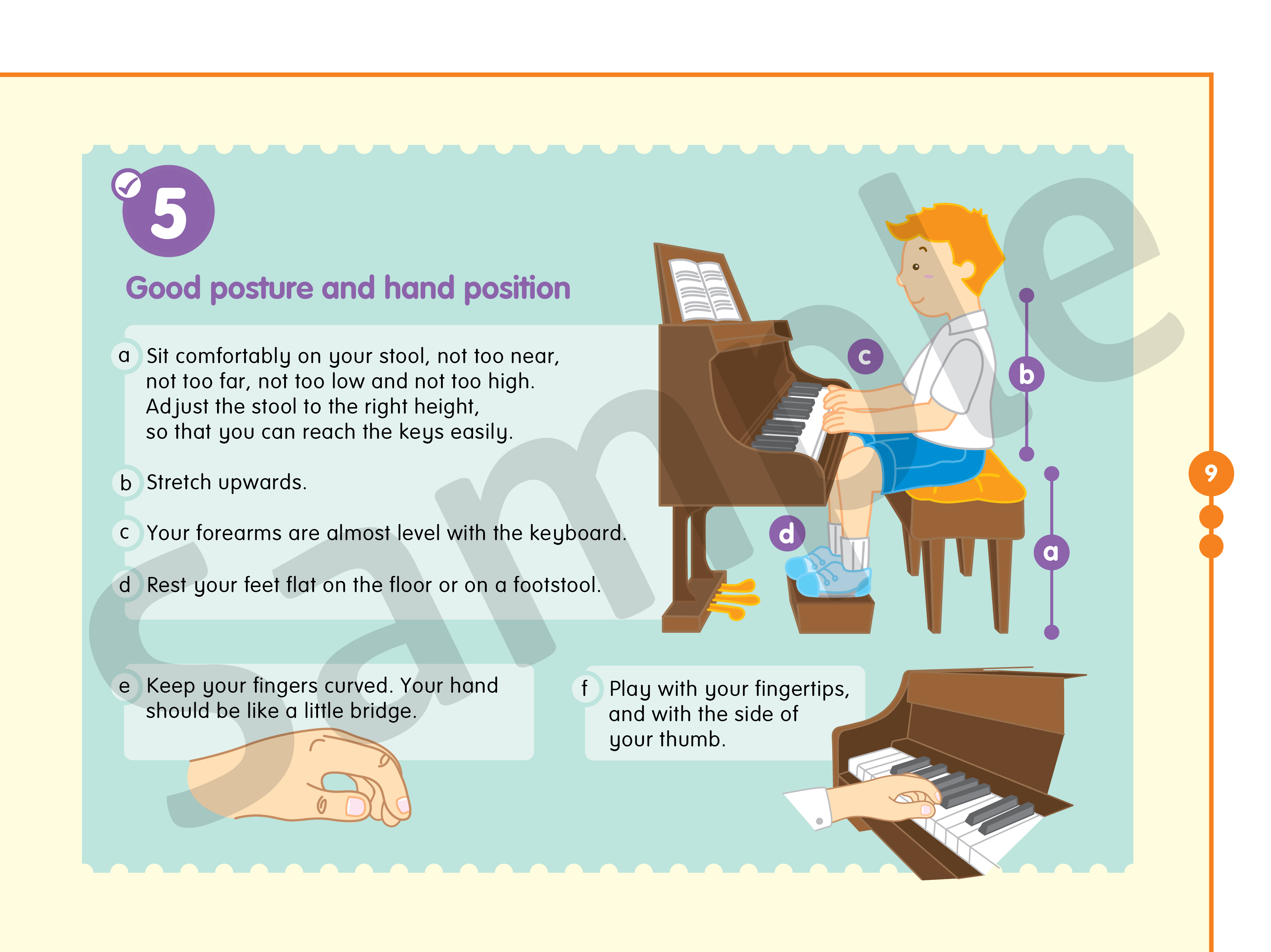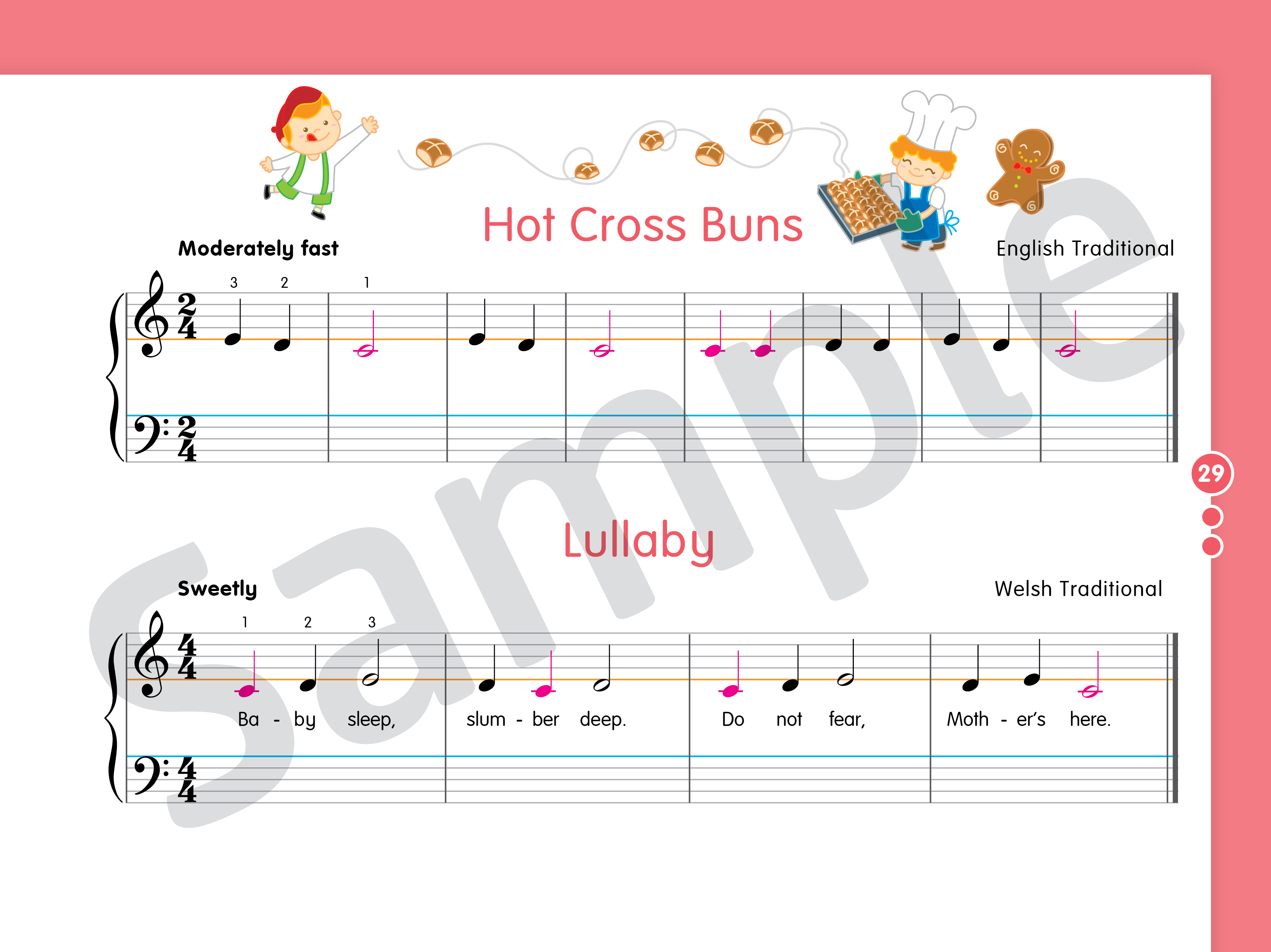 Book 1 introduces the child to the keyboard, staves, clefs, simple time signatures, note values, and rests. Reading encompasses notes to a 5th above and a 5th below Middle C. The notes A and E are introduced first, played by a braced 3rd finger of each hand. This encourages free movement of the whole arm from the shoulder and develops a natural, balanced hand position before the 5-finger position is gradually mastered. The first line of the treble stave and the fifth line of the bass stave are highlighted, and further lines are similarly treated as the child learns more notes. Staccato, slurs, ties, upbeats, and repeat signs are all experienced in Book 1. Tempo and dynamic markings encourage musical playing, and are in English, in order to avoid “knowledge overload”.