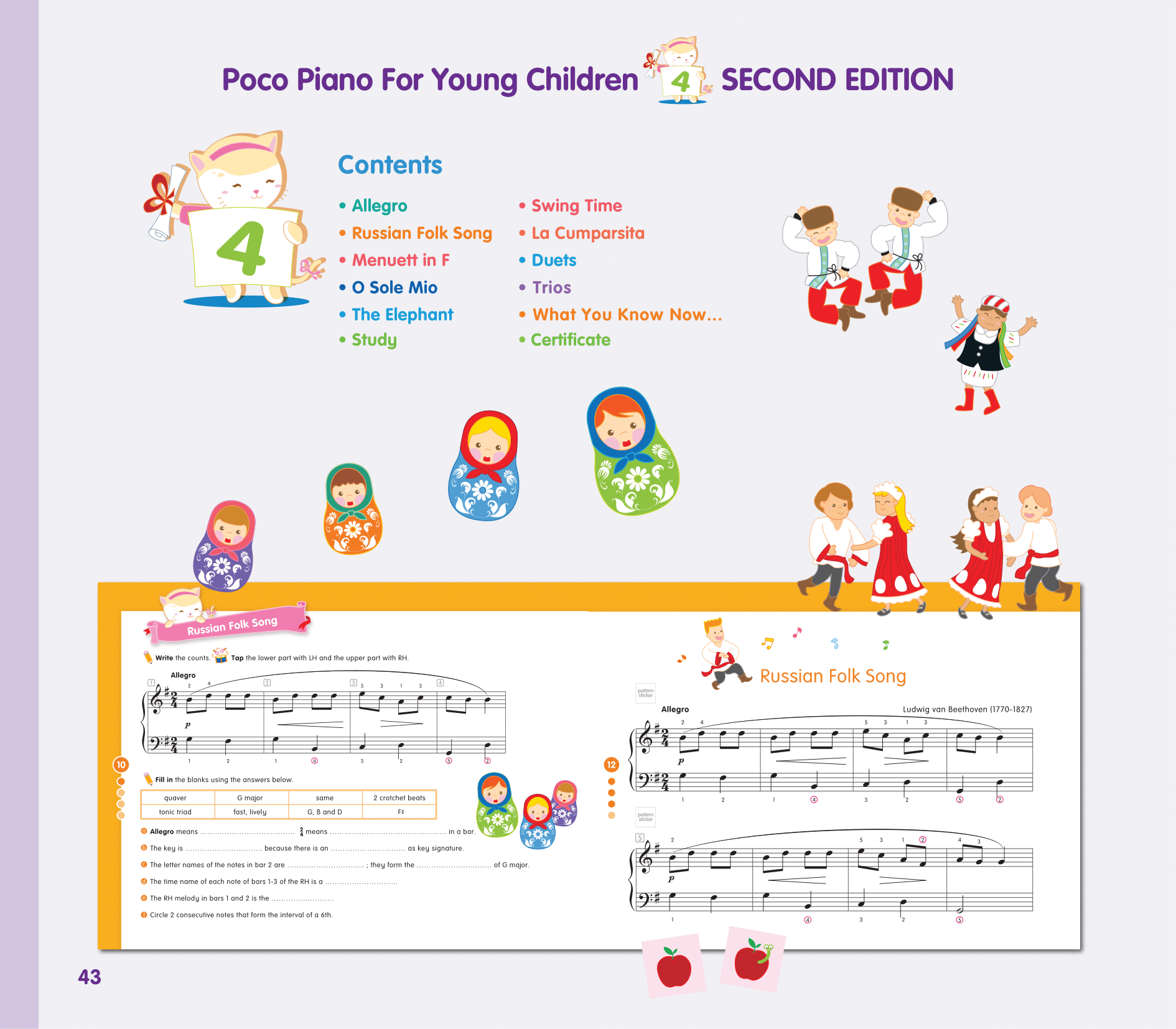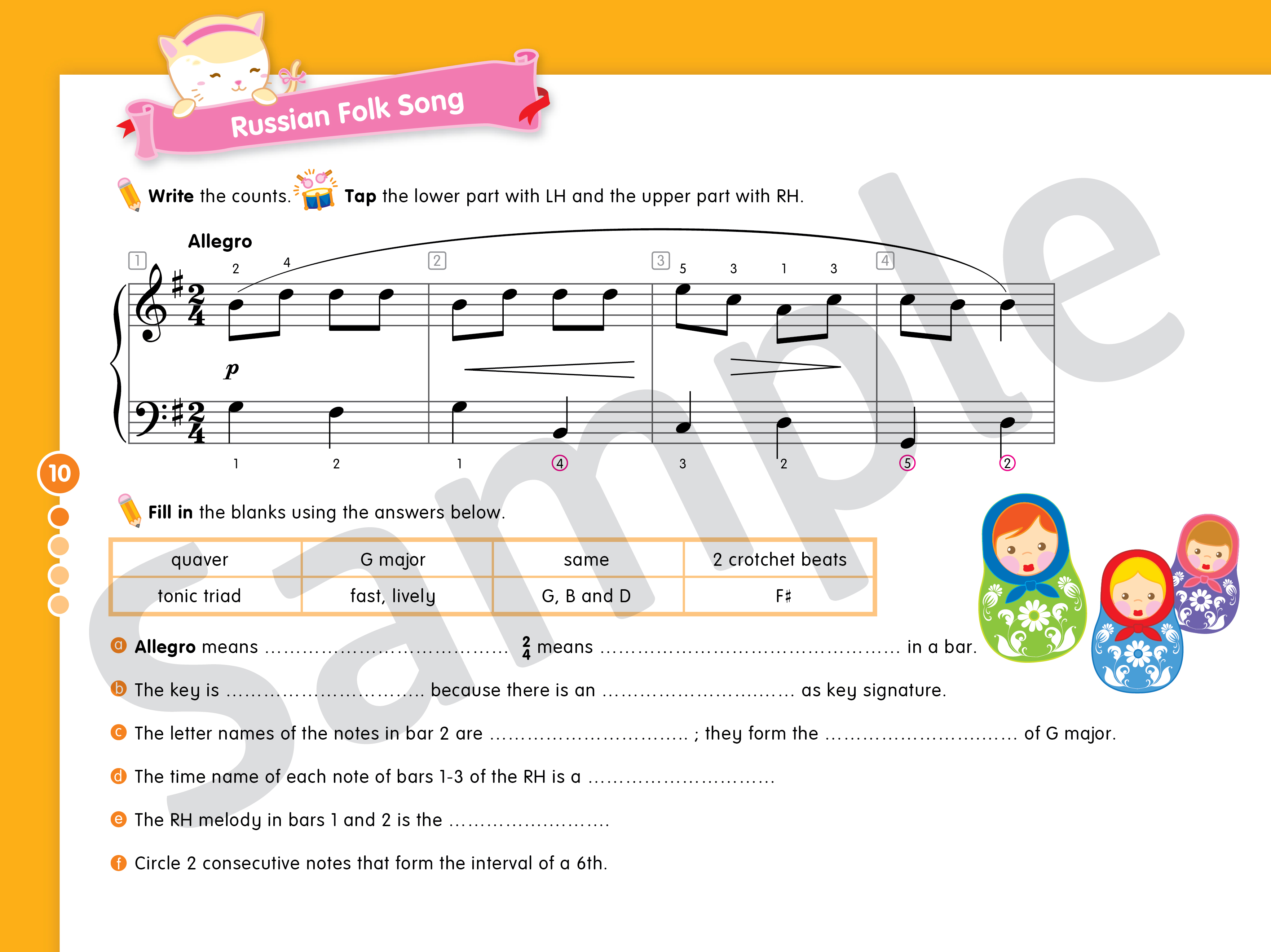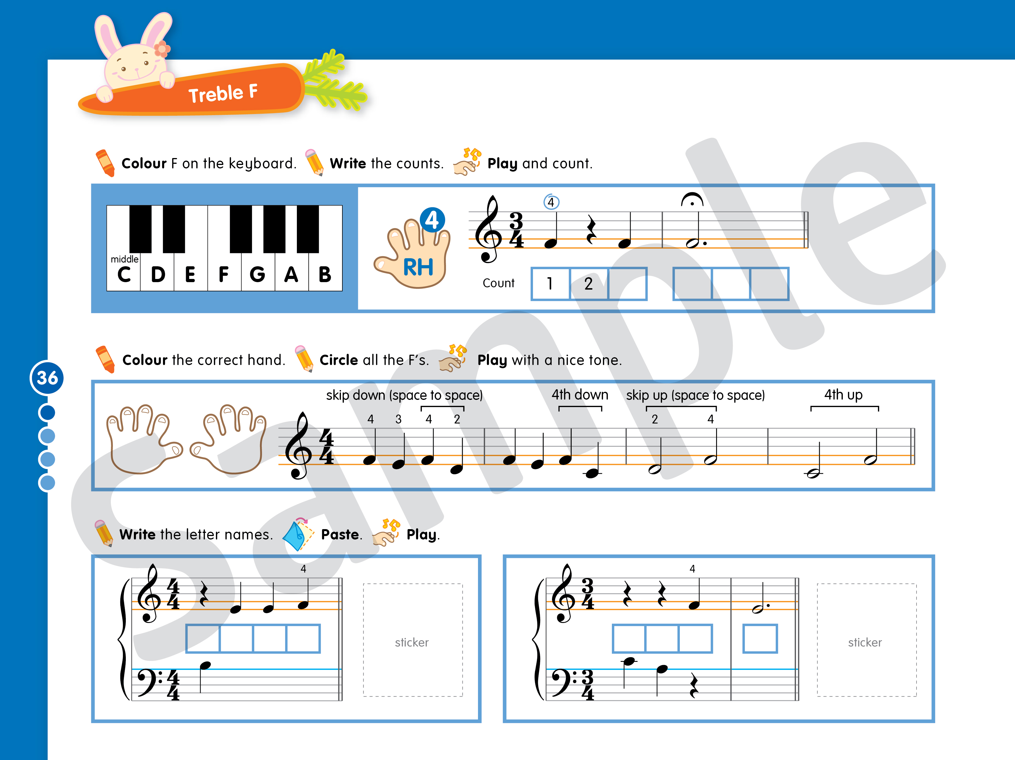 Book 4 reinforces and revises all concepts learned in Books 1-3. It contains an attractive repertoire in various styles and from different periods. Each piece has a comprehensive preparation section covering the musical, technical, and structural matters which will be encountered. The aim is to cultivate critical thinking and musical awareness in the student. As in previous books, the child is actively involved through the use of writing, coloring, tracing, and pasting, thereby making the preparation an enjoyable activity. The standard of the repertoire approaches that of Grade 1.
