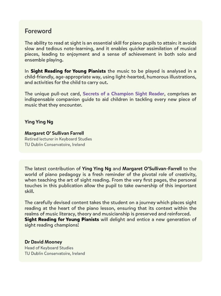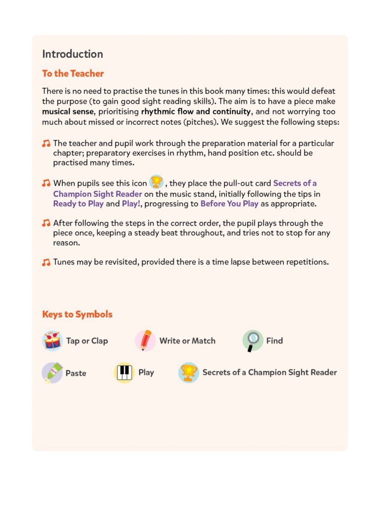 The book uses a well-sequenced and systematic approach for teaching sight-reading. Sight-reading is the ability to read and play music at first sight. It is a valuable essential skill, and students should develop it, not only because it is part of the music grade examinations, but because it makes playing music fun. However sight-reading is often neglected. Students tend to rely on memorizing the music instead of reading it.